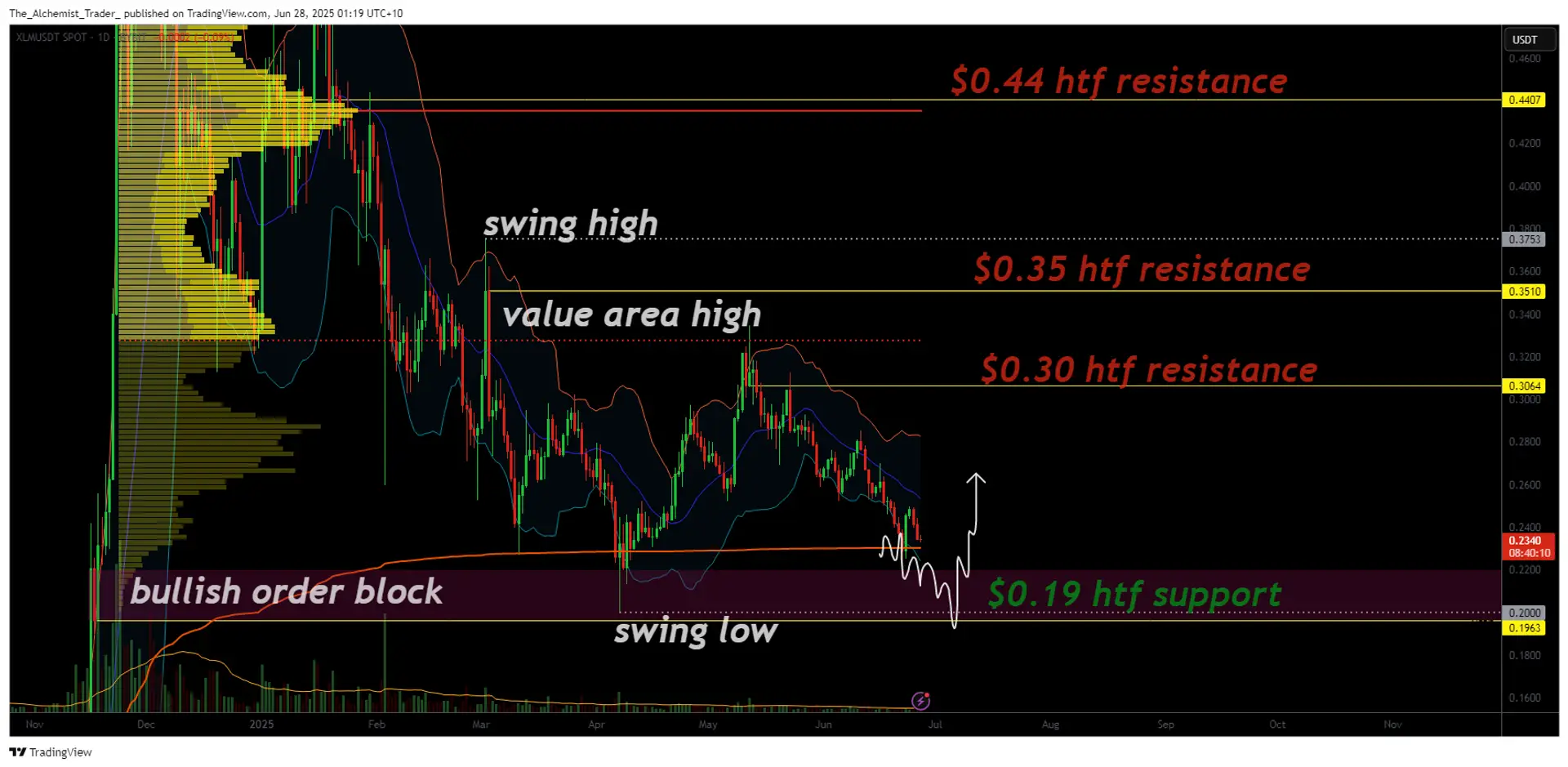 Should XLM bounce from $0.19 with conviction, upside targets include $0.30 and $0.35—both major resistance levels that previously acted as supply zones. These levels would be natural milestones for any significant reversal move.