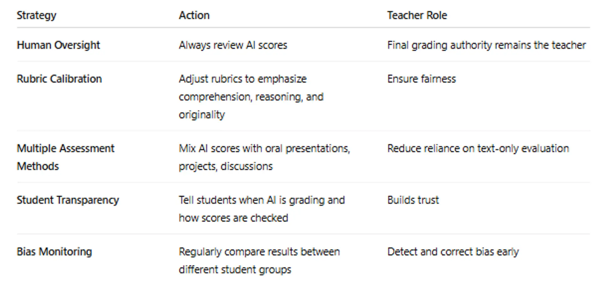 By actively monitoring, correcting, and contextualizing AI-generated grades, educators ensure that assessments remain accurate, equitable, and human-centered.