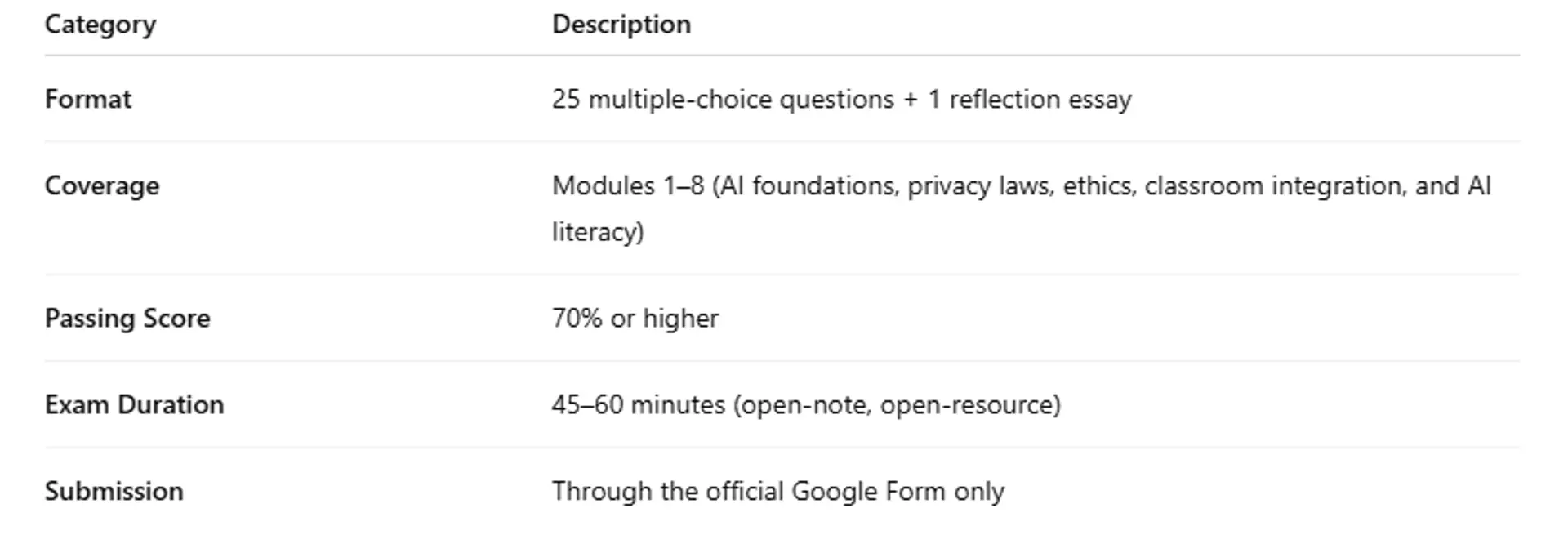 By passing the Final Exam, you officially demonstrate your ability to apply AI ethically, effectively, and confidently in educational contexts.