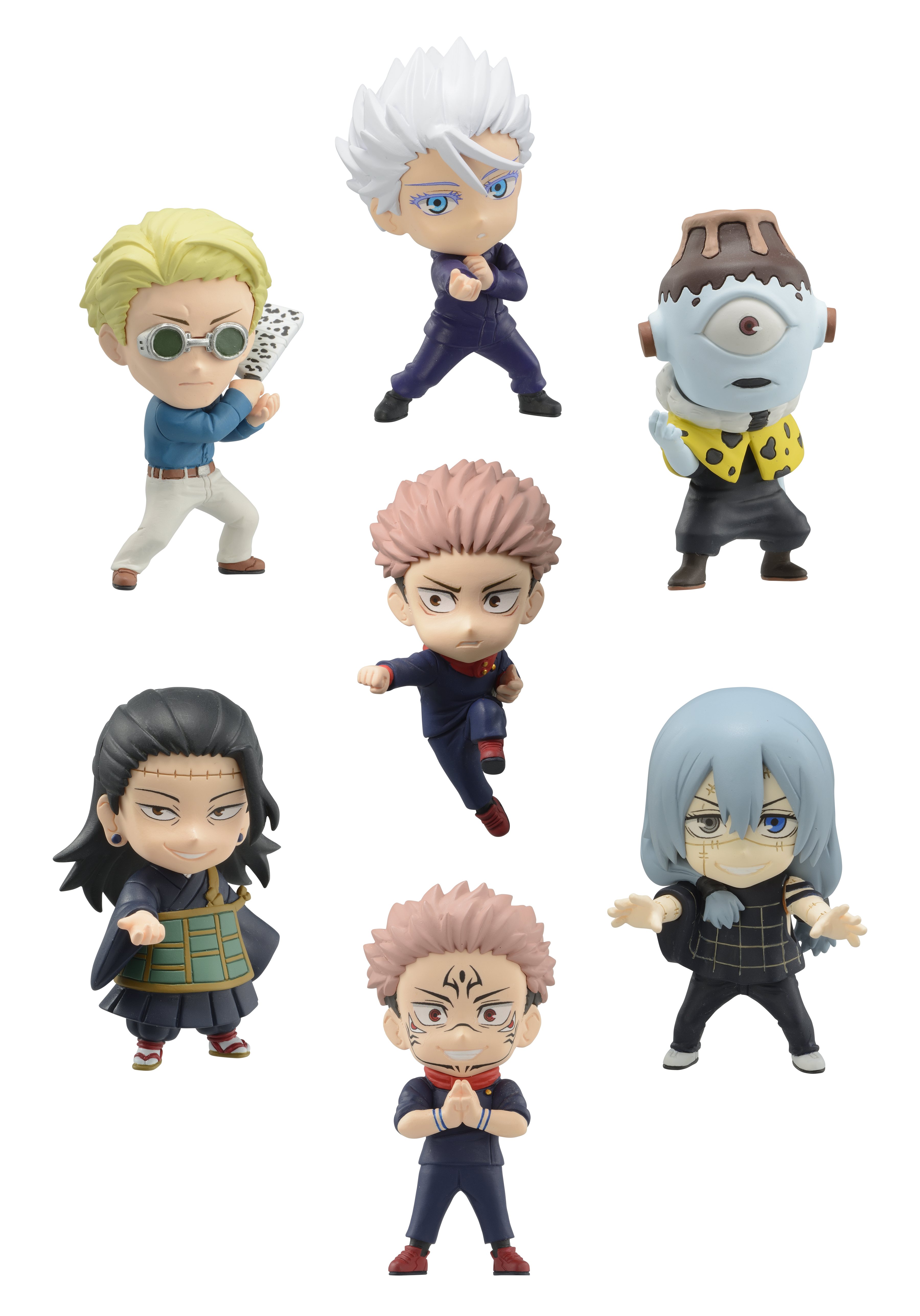 Jujutsu Kaisen Adverge Motion returns with Volume 2! Featuring chibi style characters from Jujutsu Kaisen in action poses from the anime measuring approx. 2.17". Lineup includes: Yuji Itadori, Kenjin Nanami, Satoru Gojo, Suguru Geto, Jogo, Mahito, and Sukuna. This is a COMPLETE SET of all 7 Characters! Each character includes a stand to support their action pose.